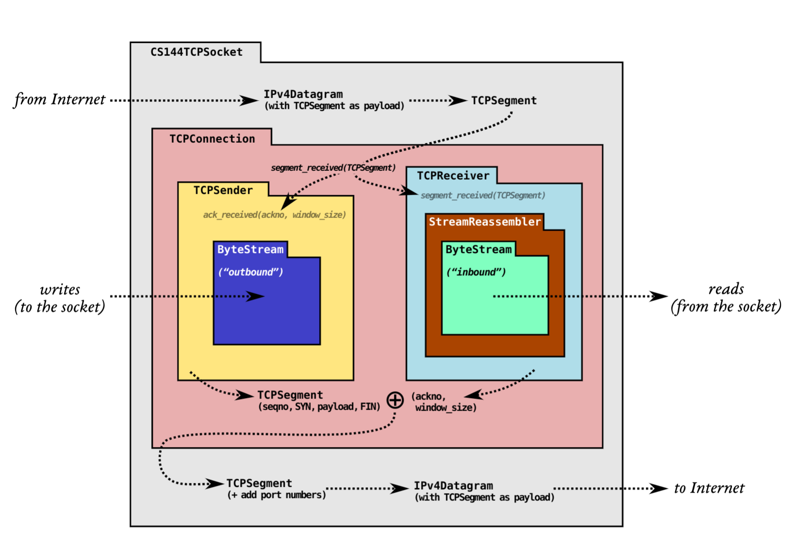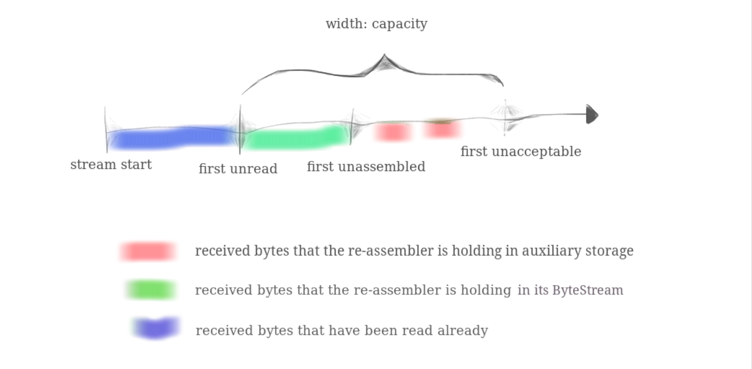 Lab 1 要求实现一个 StreamReassembler,在 Lab 的 TCP 实现图当中(上图)可以看到 TCPReceiver 具有一个 StreamReassembler 用来重组接收到的 Bytes,CS144 目的就是实现一个能够在不可靠数据报传输网络上传输两个 ByteStreams 的 TCP 程序。