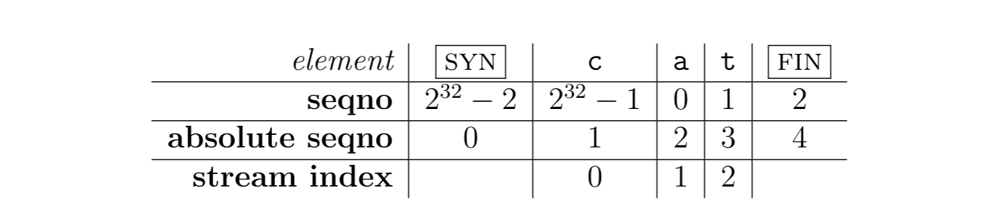 PDF 上面有一个例子,例如 byte stream 中保存的数据为 string 为 cat,并且 SYN = 2^32 - 2,那么三者值如下:
